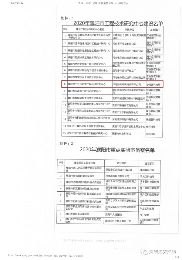 根據(jù)《濮陽市工程技術(shù)研究中心管理辦法》(濮科〔2020〕23號)、《濮陽市重點實驗室備案管理辦法》(濮科〔2018〕41號)相關(guān)規(guī)定,經(jīng)主管部門推薦、申報材料審查、現(xiàn)場考察、專家評審答辯、局黨組擴大會研究審定、公示等環(huán)節(jié),我公司“濮陽市工業(yè)水處理工程技術(shù)研究中心”申報成功,濮陽市科技局同意建設(shè)(備案)。