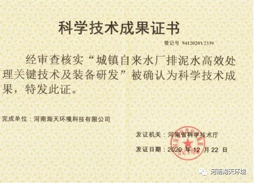 2020年12月22日,海天環(huán)境公司的“城鎮(zhèn)自來水廠排泥水高效處理關(guān)鍵技術(shù)及裝備研發(fā)”被確認(rèn)為科技成果,取得了河南省科學(xué)技術(shù)廳頒發(fā)的科技成果證書。